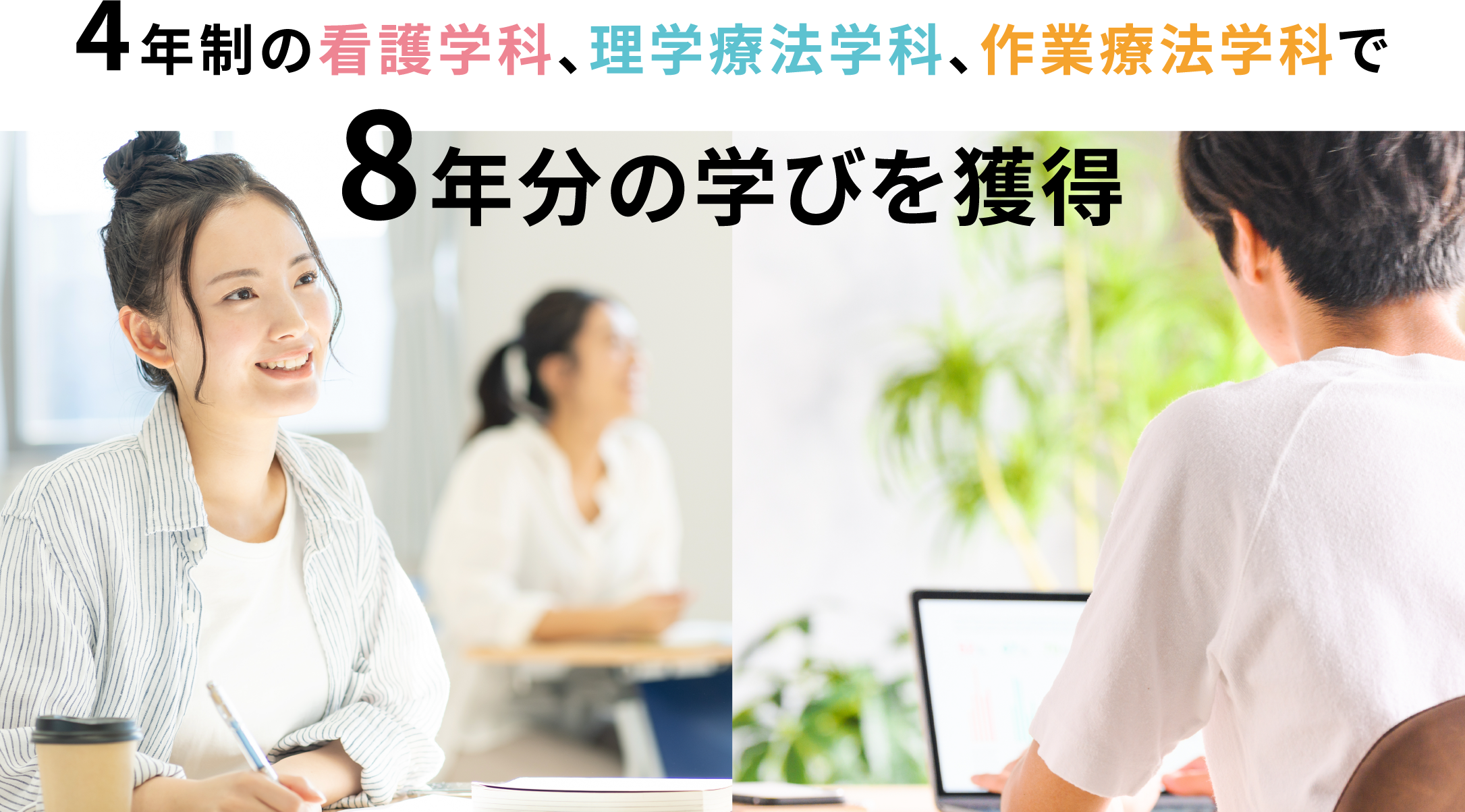 本校入学と同時に九州医療科学大学社会福祉学部スポーツ健康福祉学科に入学し、社会福祉についての知識やカウンセリングの技術を学びます。対象となる方々やそのご家族それぞれの多様なニーズに、広い視野と知識で応えられる学士の学位を持った看護師、理学療法士、作業療法士を目指します。