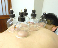 ガラス製のカップを患部に吸いつけ、陰圧状態に保つ治療法です。血流の改善により疲労物質を取り出す効果が期待できます。治療後に一週間ほどあざの様な跡が残ります。筋疲労や頑固なコリにお試しください。(悪い所ほど色が濃く出ます。)